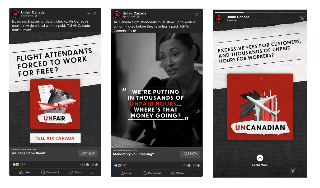 My team's 360 campaign fired up Canadians from all walks of life and as the CEO and government ordered workers to end the strike, outrage flared forcing Air Canada to finally step up for their workers in a historic agreement. 49+ million impressions, hundreds of thousands of dollars in earned media, 23+ million video completions and over 7K emails sent to the CEO.